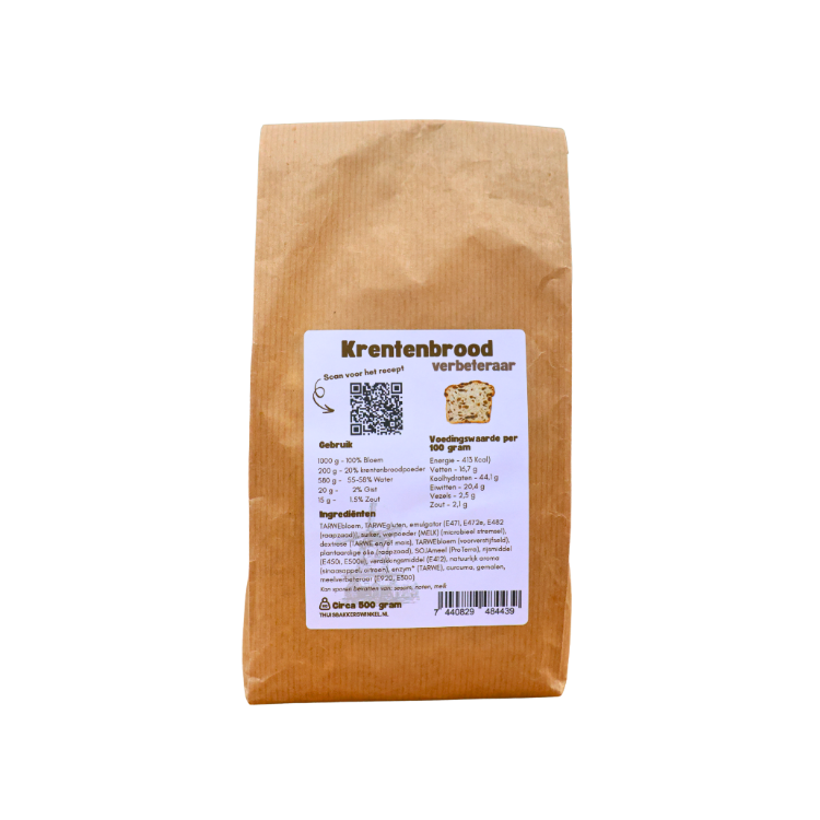 Deze krentenbroodmix is een poedervormige broodverbeteraar. Deze is handig omdat het helpt bij het verbeteren van de structuur, smaak en houdbaarheid van krentenbrood. Het maakt het deeg sterker, zodat het de rozijnen of krenten goed kan dragen, en zorgt ervoor dat het brood luchtiger en zachter wordt. Het helpt ook mee om je baksels wat extra lang vers te houden.