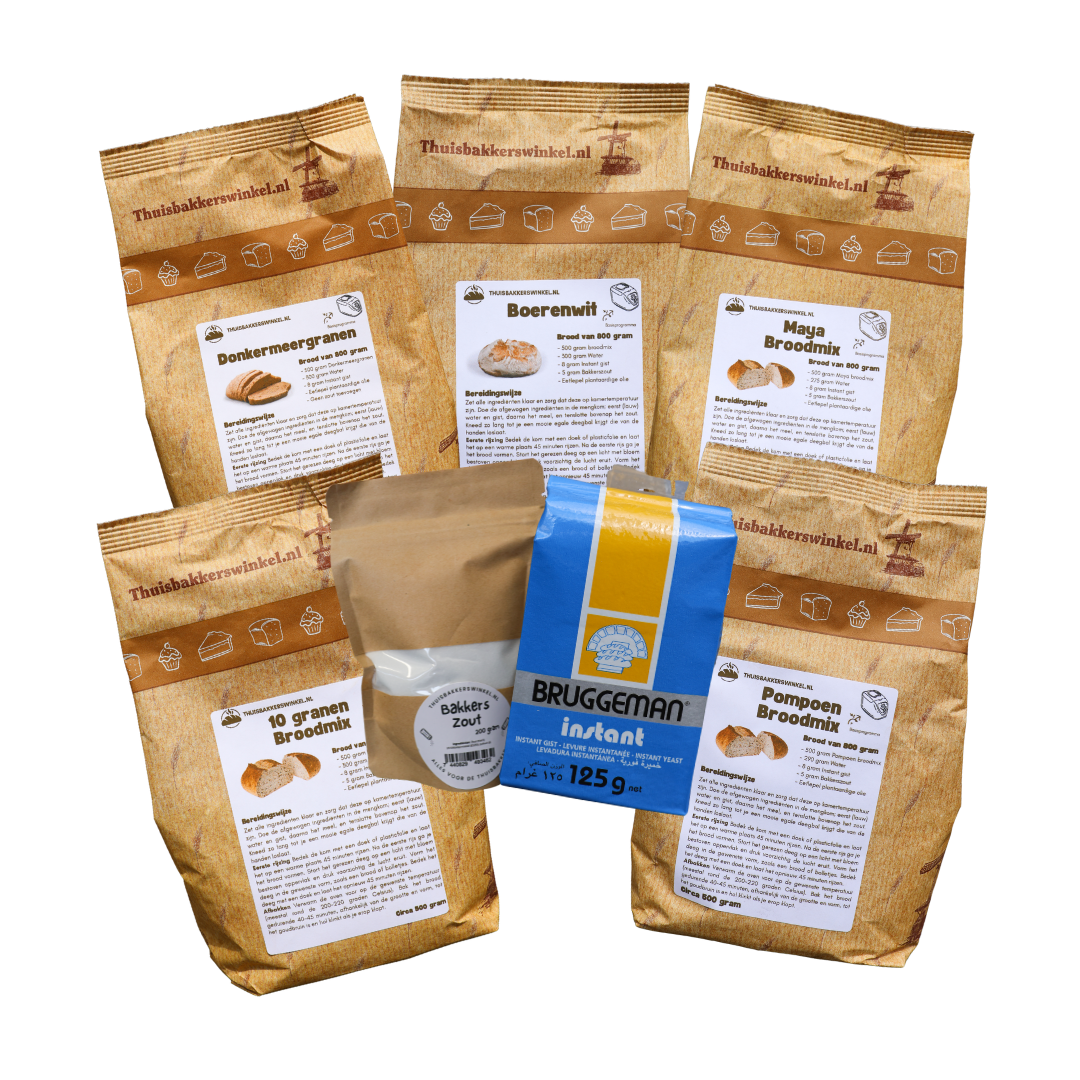 Ontdek zelf welk brood het beste bij jou past door dit starterspakket. In dit starterspakket zitten 5 verschillende broodmixen, bakkerszout en instant gist. Eenvoudig een vers brood bakken met je broodbakmachine of misschien wel gewoon met de hand. Een brood-bak startpakket helpt je op weg om broodbakken leuk te maken. Het is niet alleen gemakkelijk, het resultaat is goed en het geeft ook nog eens een heerlijke geur in huis.